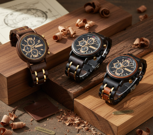 We use premium sustainably sourced hardwoods including bamboo, walnut, maple, and ebony. Each wood type offers unique grain patterns and color variations, making every watch truly one-of-a-kind. All our wood is responsibly harvested.